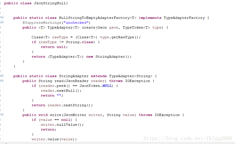 public static class NullStringToEmptyAdapterFactory<T> implements TypeAdapterFactory {
