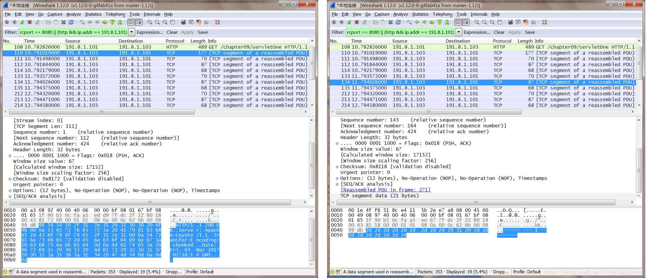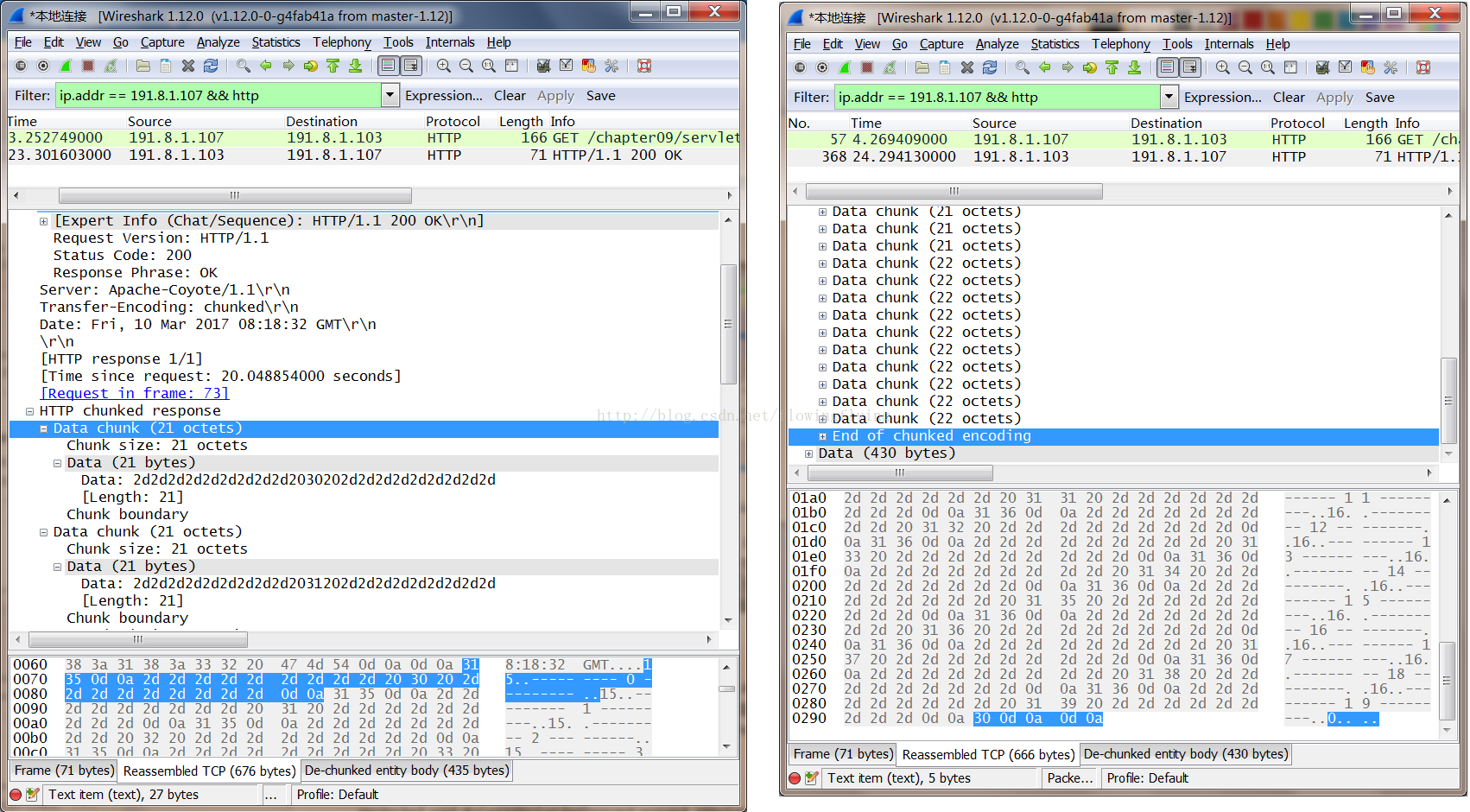 测试例子1,由于通过flush()进行了强制输出,所有并不清楚最终的消息长度,所以消息头填入:Transfer-Encoding: "chunked"。我们通过抓包来看: