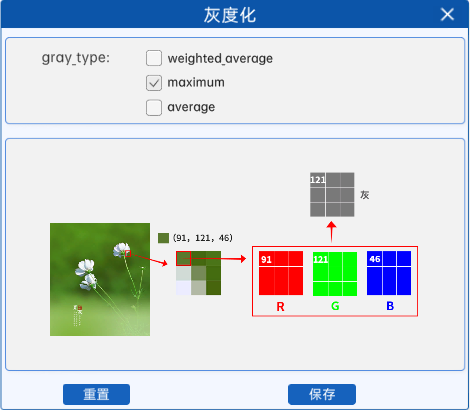 例如某图像中某像素点的像素值如上图所示,那么在使用最大值法进行灰度化时,就会从该像素点对应的RGB通道中选取最大的像素值作为灰度值,所以在灰度图中的对应位置上,该像素点的像素值就是121。