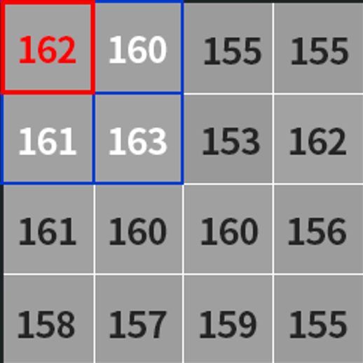 假如我们使用的小区域是3*3的,那么就会从图片的左上角开始(也就是像素值为162的地方)计算其邻域内的平均值,如果处于边缘地区就会对边界进行填充,填充值就是边界的像素点,如下图所示: