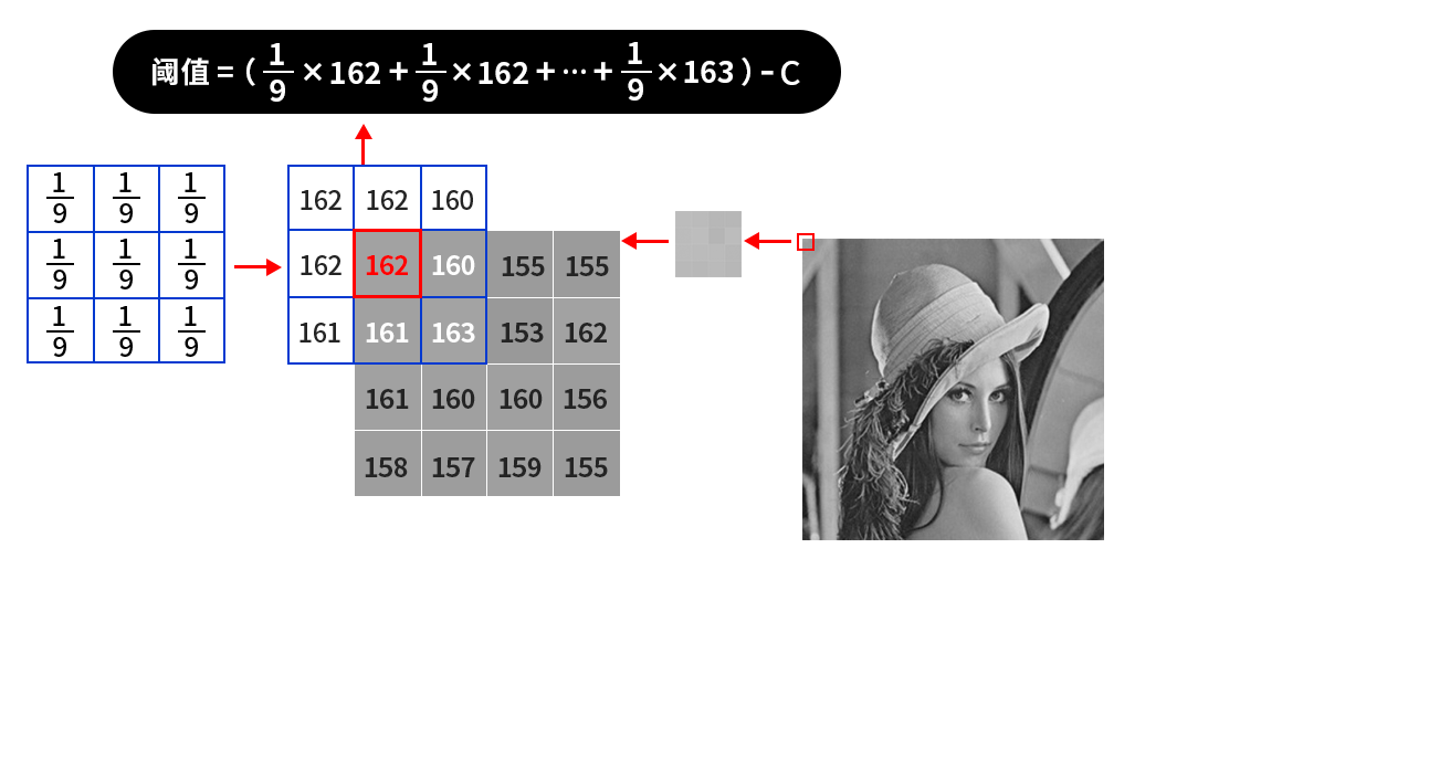 那么对于左上角像素值为162的这个点,161(也就是上图中括号内的计算结果,结果会进行取整)就是根据平均值计算出来的阈值,接着减去一个固定值C,得到的结果就是左上角这个点的二值化阈值了,接着根据选取的是阈值法还是反阈值法进行二值化操作。紧接着,向右滑动计算每个点的邻域内的平均值,直到计算出右下角的点的阈值为止。我们所用到的不断滑动的小区域被称之为核,比如3*3的小区域叫做3*3的核,并且核的大小都是奇数个,也就是3*3、5*5、7*7等。