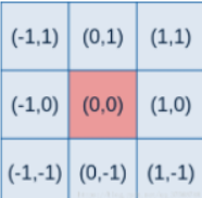 高斯概率函数是相对于二维坐标产生的,其中(x,y)为点坐标,要得到一个高斯滤波器模板,应先对高斯函数进行离散化,将得到的值作为模板的系数。例如:要产生一个3*3的高斯权重核,以核的中心位置为坐标原点进行取样,其周围的坐标如下图所示(x轴水平向右,y轴竖直向上)