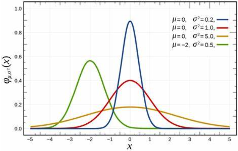 通过改变函数中和的值,我们可以得到如下图像,其中均值为μ,标准差为σ²。