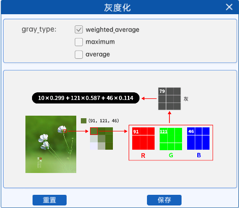 例如某图像中某像素点的像素值如上图所示,那么在使用加权平均值进行灰度化时,其计算结果就是10*0.299+121*0.587+46*0.114=79。所以在灰度图中的对应位置上,该像素点的像素值就是79。