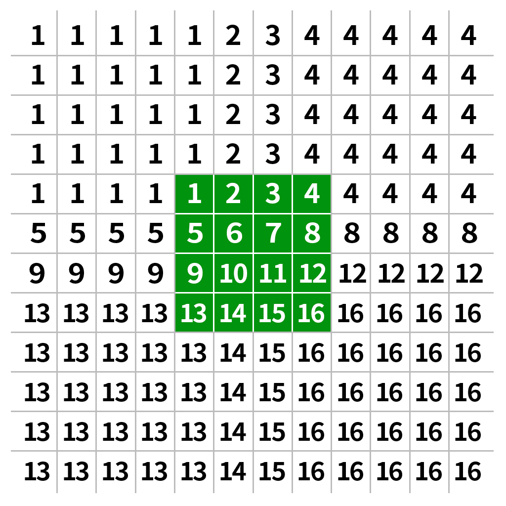 对于边界的像素点,则会进行边界填充,以确保卷积核的中心能够对准边界的像素点进行滤波操作。在OpenCV中,默认的是使用BORDER_REFLECT_101的方式进行填充,下面的滤波方法中除了中值滤波使用的是BORDER_REPLICATE进行填充之外,其他默认也是使用这个方式进行填充,因此下面就不再赘述。通过卷积核在原图上从左上角滑动计算到右下角,从而得到新的4*4的图像的像素值。