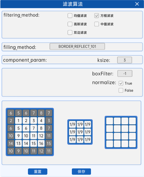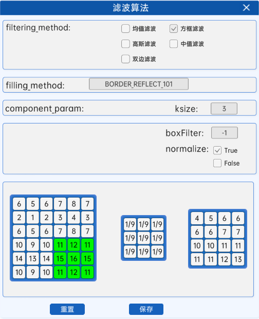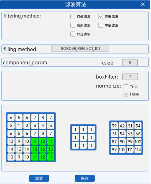 在滤波算法组件中,当参数filtering_method选为方框滤波时,参数component_param为ksize,ddepth,normalize。下面讲解这3个参数的含义: