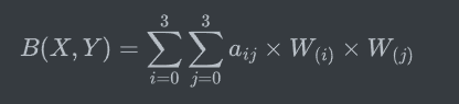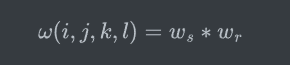 此时可以看到,这与上面的滤波中计算过程已经一模一样了,m_1/M_1就代表了第一个点的权重。接下来我们看看ω(i,j,k,l)是怎么来的,令