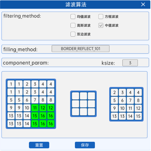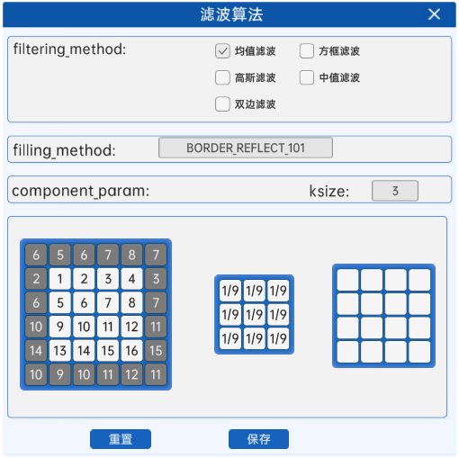 在滤波算法组件中,当参数filtering_method选为均值滤波,参数component_param为ksize,代表卷积核的大小,eg:ksize=3,则代表使用3×3的卷积核。