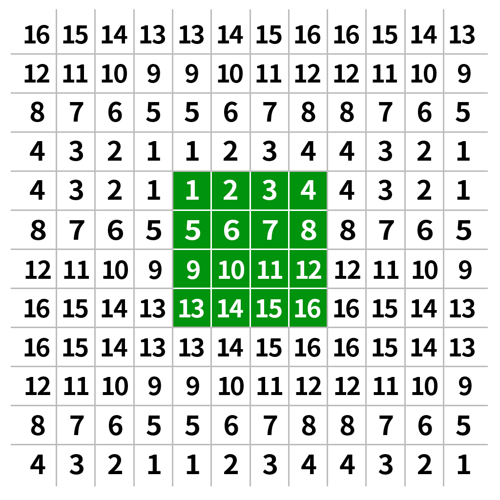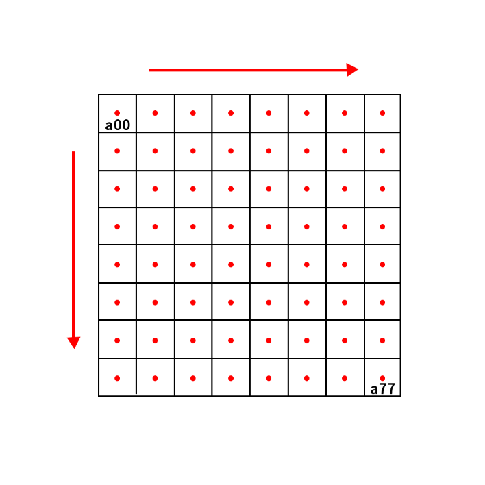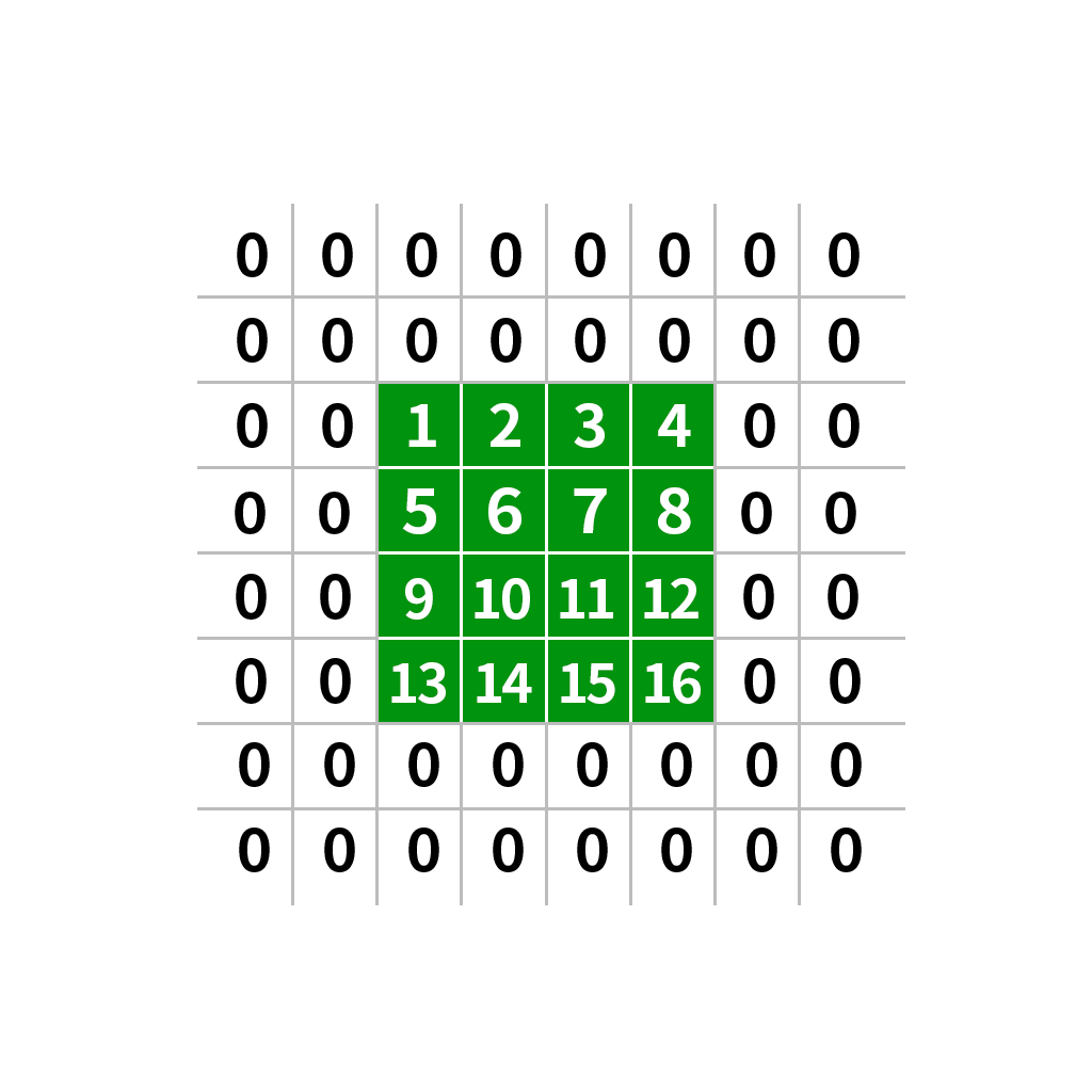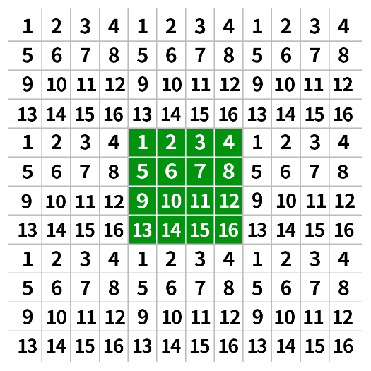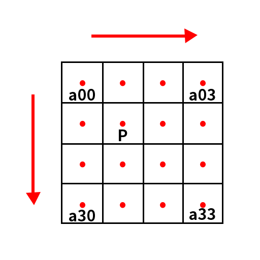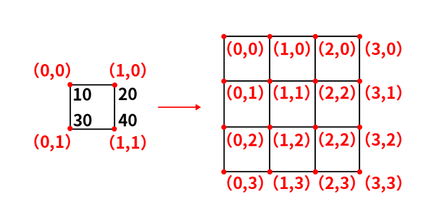 通俗的讲,该公式就是让目标图像中的每个像素值都能找到对应的原图中的像素值,这样才能根据不同的插值方法来获取新的像素值。根据该公式,我们就可以得到每一个目标点所对应的原图像的点,比如一个2*2的图像放大到4*4,如下图所示,其中红色的为每个像素点的坐标,黑色的则表示该像素点的像素值。