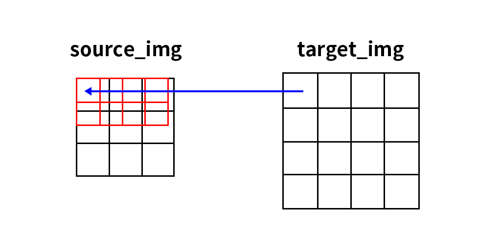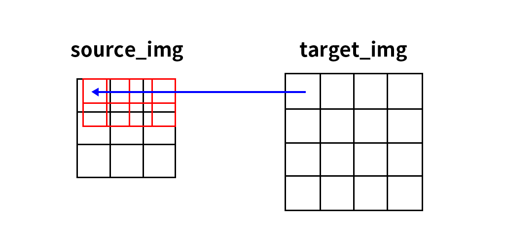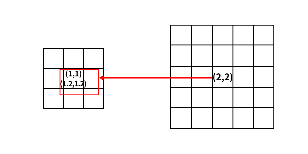 也就是原图中的(0.5,0)点,因此需要对计算出来的坐标值进行取整,取整后的结果为(0,0),也就是说放大后的图像中的(1,0)坐标处对应的像素值就是原图中(0,0)坐标处的像素值,其他像素点计算规则与此相同。