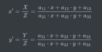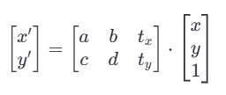 二维空间中,图像点坐标为(x,y),仿射变换的目标是将这些点映射到新的位置 (x', y')。