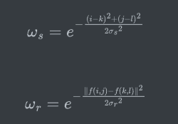 双边滤波采用了两个高斯滤波的结合,一个负责计算空间邻近度的权值(也就是空域信息),也就是上面的高斯滤波器,另一个负责计算像素值相似度的权值(也就是值域信息),也是一个高斯滤波器。其公式如下所示: