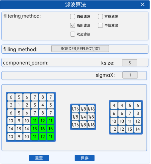 在滤波算法组件中,当参数filtering_method选为高斯滤波,参数component_param为ksize,sigmaX。下面讲解这2个参数的含义: