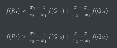 那么根据公式我们就可以计算出放大后的图像(0,0)点对应的原图像中的坐标为: