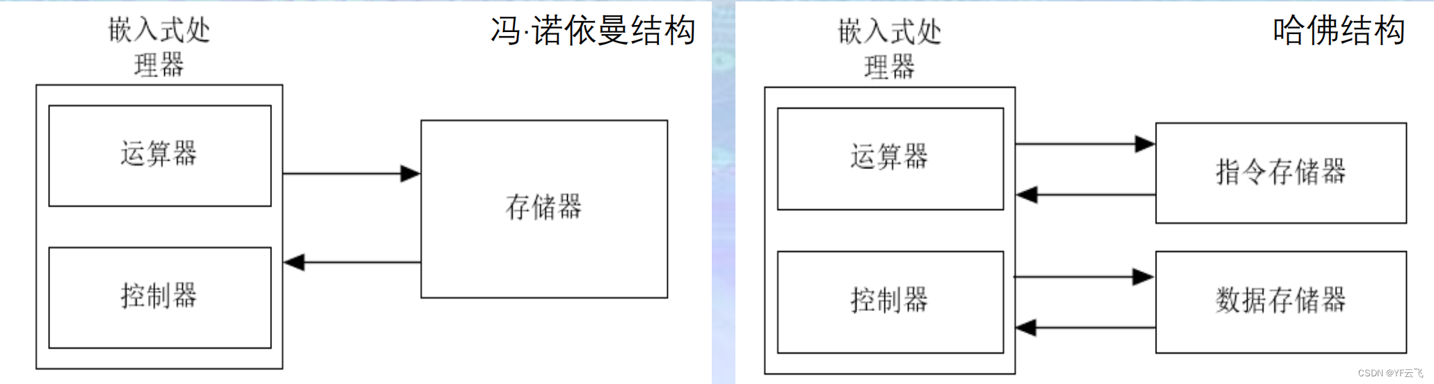 3、嵌入式处理器从体系上分类,可以分为冯·诺依曼结构和哈佛结构两种: