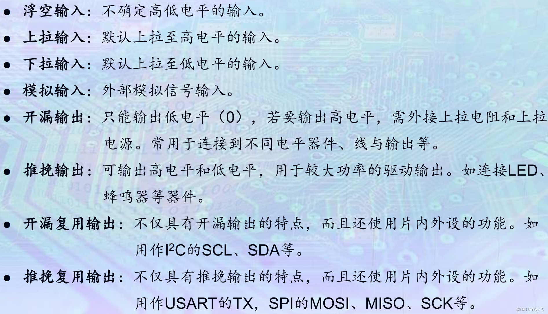 口诀:浮空上下模拟入,开推输出赢天下。 开推复用功能多,I2C、USART、SPI便捷多。