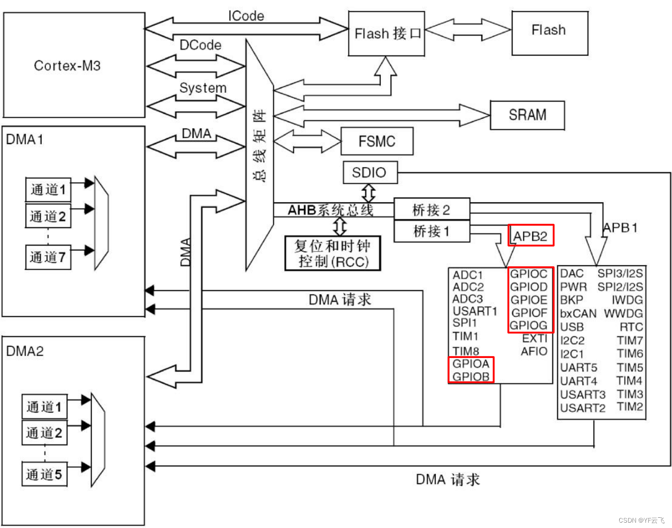 DMA 可实现数据传输(存储器与存储器、外设与存储器等)。支持闪存、SRAM、外设的 SRAM 以及 APB1、APB2 和 AHB 外设作为源和目标。共有 12 个通道(DMA1 有 7 个,DMA2 有 5 个)。每个通道连接专用硬件 DMA 请求并支持软件触发。通道优先级可设定(很高、高、中等、低),相等时由硬件决定。