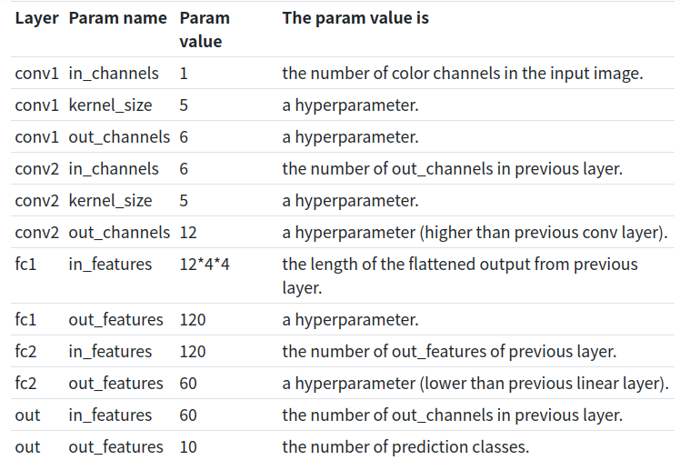 我们将更多地了解网络的内部工作方式,以及在实现forward() 函数时张量是如何流经网络的。现在,一定要查看这个描述每个参数的表,以确保您能够理解每个参数值是如何确定的。