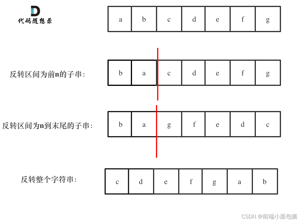 本题使用双指针即可实现:一个从字符串前面,一个从字符串后面,两个指针同时向中间移动,并交换元素。过程如下: