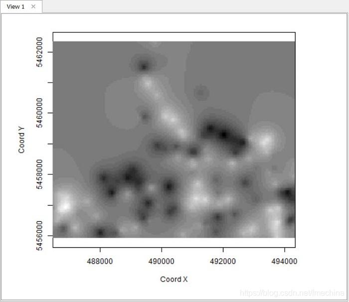· image(kc, loc = pred.grid, col=gray(seq(1,0,l=30)), xlab="Coord X", ylab="Coord Y")