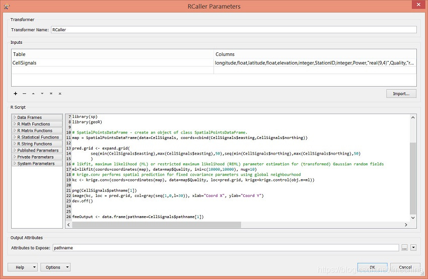 RCaller转换器允许比StatisticsCalculator转换器多得多的统计分析。此示例显示如何使用RCaller从点创建栅格。Kriging是一种插值方法,用于根据单元信号点数据创建一个拟合曲面。