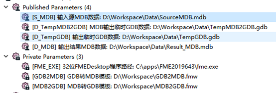 “MDB2GDB”为制作的MDB转GDB模板本机存放路径,如“D:\Workspace\MDB2GDB.fmw”