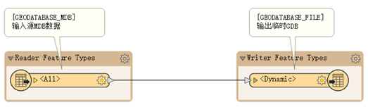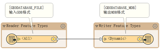 利用32位FME Desktop制作一个通用型的GDB转MDB模板,这个模板只需要做数据的读取和数据的写出操作,不进行任何空间或者属性的处理。如下图: