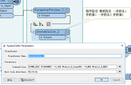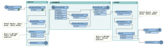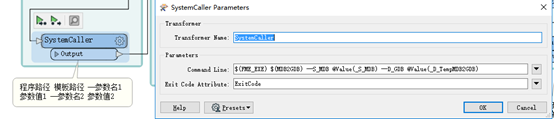 同时,在主模板中通过“SystemCaller”转换器的来实现32位FME Desktop程序的调用,在“SystemCaller”转换器中设置好执行语句,本文中调用模板的语法结构如下:“程序路径<空格>模板路径<空格>--参数名1<空格>参数值1<空格>--参数名2<空格>参数值2”,