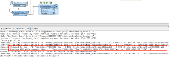 “C:\apps\FME2019643\fme.exe D:\Workspace\MDB2GDB.fmw --S_MDB D:\Workspace\Data\SourceMDB.mdb --D_GDB D:\Workspace\Data\TempMDB2GDB.gdb”