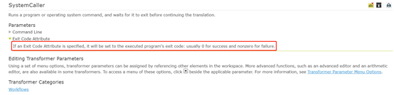 注意,在利用“SystemCaller”转换器的来实现32位FME Desktop程序的调用的过程中,如果“SystemCaller”转换器中的“Exit Code Attribute”参数如果没有设置,当调用失败的情况下,后续的流程中是无法判断“SystemCaller”转换器是否执行成功,因此我们需要设置“Exit Code Attribute”参数,以便后续利用Tester等参数来进行过滤是否执行成功。
