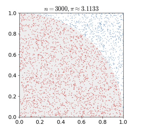 通过讨论我们知道,以上图形中的散点要求在正方形内随机且均匀的分布。直观上,散点数量必须足够多,才可以反应出这种比例关系。简单来讲,就是若只有少量散点, 近似效果差; 散点数量越多, 近似效果越好。