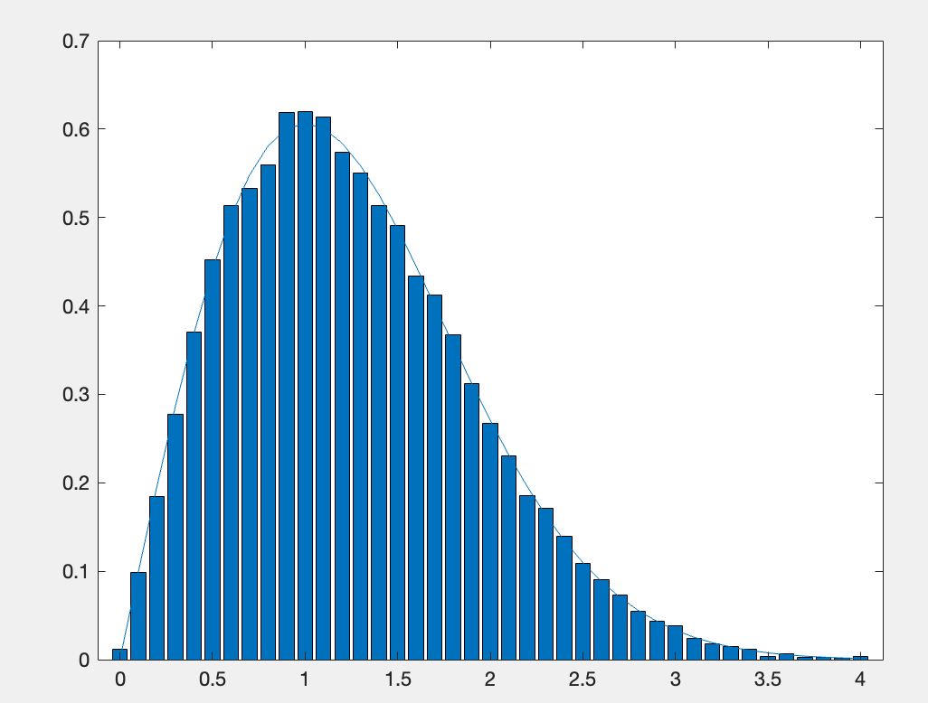 令b=1,生成个Rayleigh分布的随机数,并用直方图检验生成数据的概率分布情况。