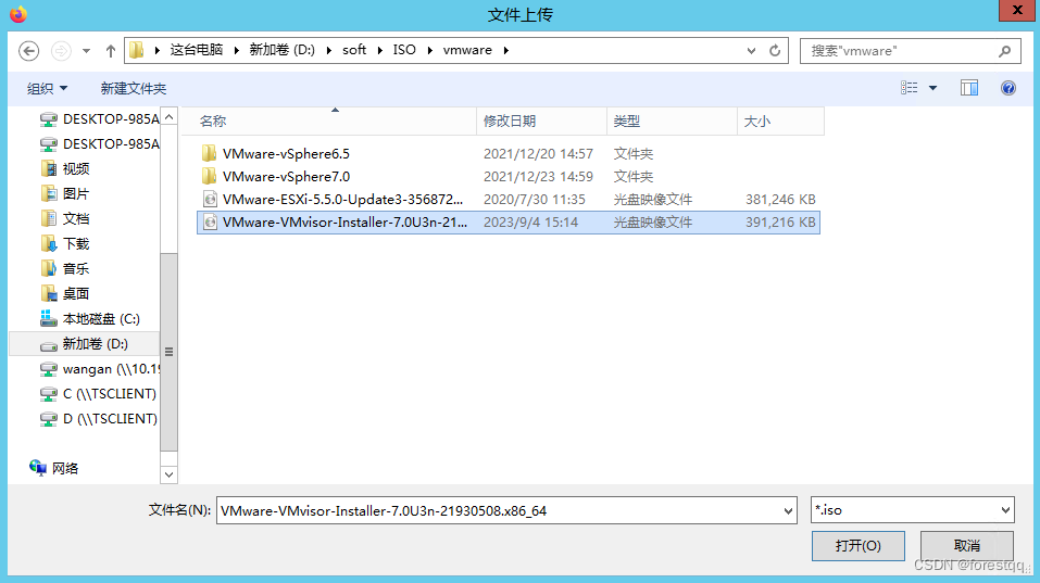 6、 选中VMware-VMvisor-Installer-7.0U3n-21930508.x86_64.iso文件