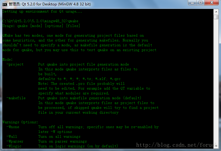 一旦你打开了命令行工具,它会帮你设置好 Qt 需要的环境变量,敲一个 qmake 命令试试吧。如和 图 2 所示: