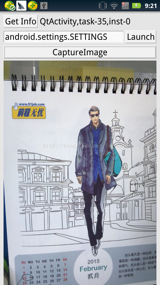 第三排是“Capture Image”按钮,点击它会调用系统的拍照功能来捕获一张图片,并将这张照片显示在界面上。这个功能,我使用 QAndroidActivityResultReceiver 来处理结果。因为拍照可能被取消。