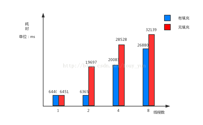 从结果看来,有填充代码的比无填充代码的效率提高了3倍多。下面是笔者测试的,线程数与耗时的测试结果: