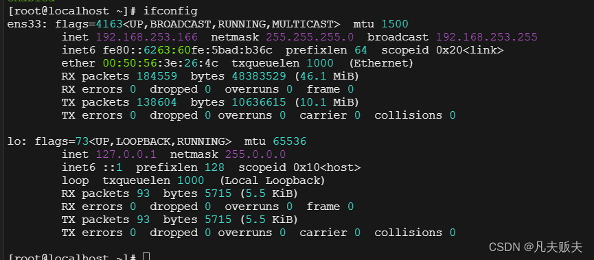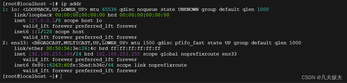 - inet 192.168.253.166和inet 127.0.0.1:这是接口的IPv4地址,分别是ens33和lo接口的IPv4地址。
