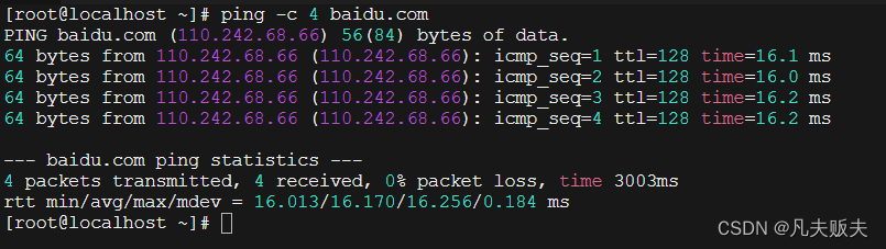 - 4 packets transmitted, 4 received, 0% packet loss, time 3004ms:表示共发送了4个数据包,全部都成功接收,没有丢失任何数据包,总共花费了3004毫秒。