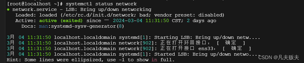 Active: active (exited):表示服务当前处于活动状态,但已经完成了其主要任务,并退出了,由此可见网络状态是正常的。