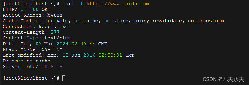 使用curl -I 命令可以向https://www.baidu.com 发送 HTTP HEAD 请求,并显示服务器返回的 HTTP 头信息,而不会下载文件内容。HTTP 响应头信息非常有用,包含有 HTTP 状态码、服务器类型、响应头等可以判断网络响应情况的重要字段。