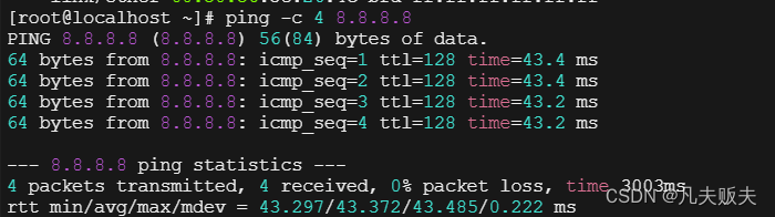 - 64 bytes from 8.8.8.8: icmp_seq=1 ttl=128 time=43.4 ms:表示从IP地址为8.8.8.8的主机收到一个大小为64字节的数据包,ICMP序列号为1,生存时间(TTL)为128,往返时间(RTT)为43.4毫秒。