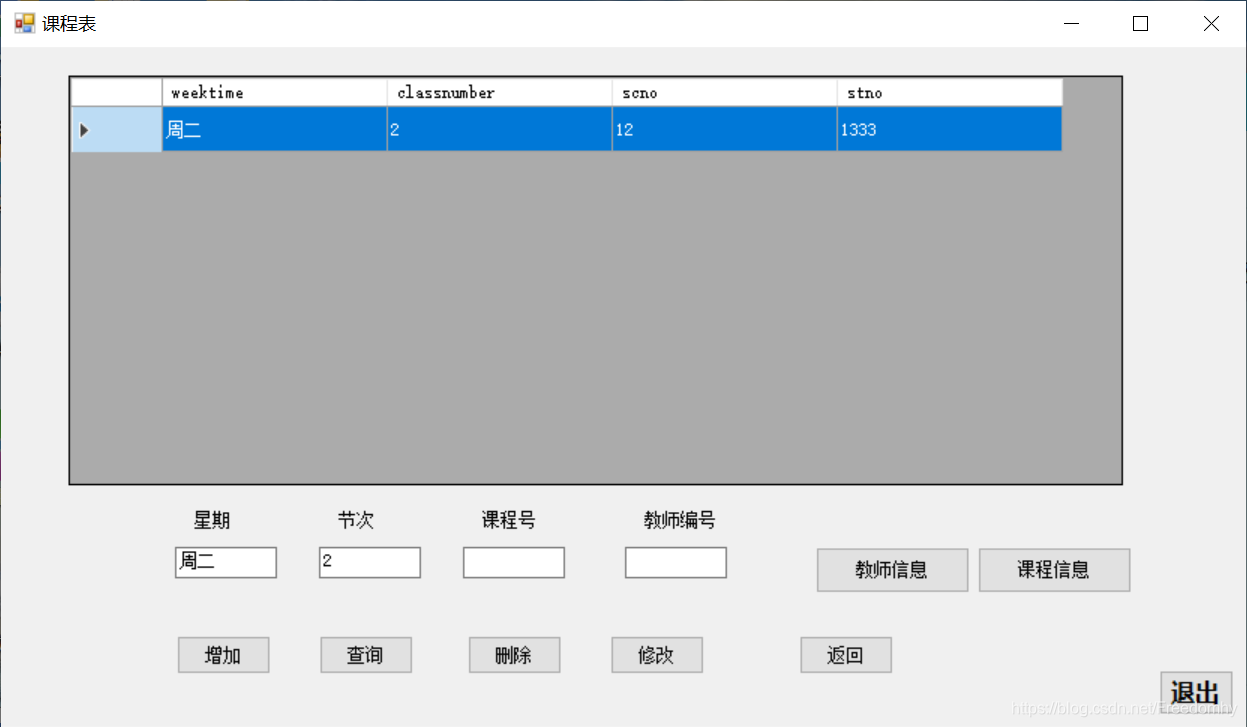 1、设及了一个个人课程表的数据库,其中主要包括三个表:课程表信息、课程信息、教师信息,后两者以课程号和教师编号为主码,分别作为课程表信息中的外码,课程表信息以星期和节次为主码,主要代码以下所示,前期有些简单,后面再慢慢完善。