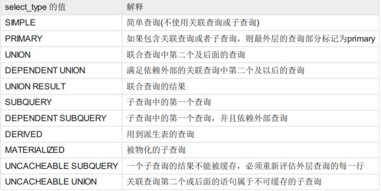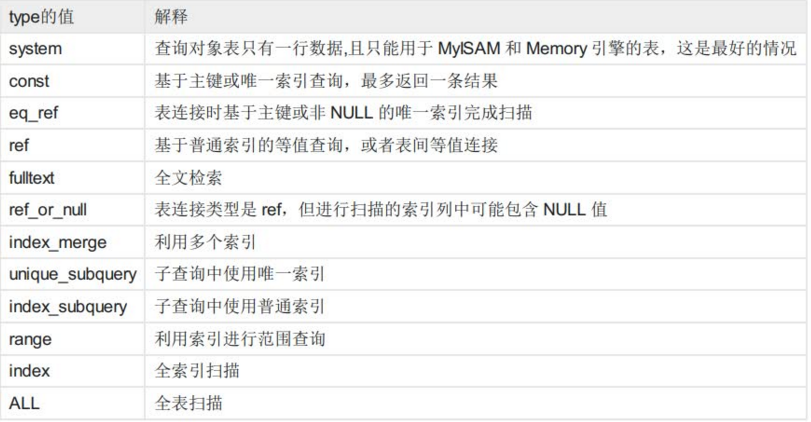表格从上到下代表了sql查询性能从最优到最差,如果是type类型是all,说明sql语句需要优化。