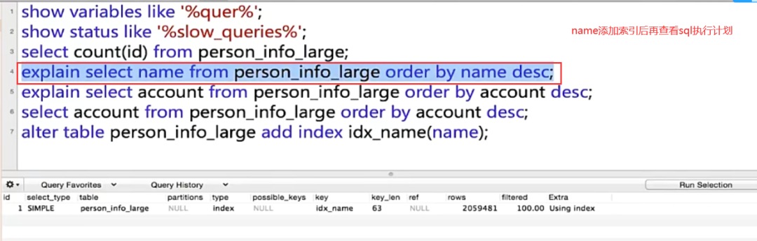 接着我们继续执行查询语句,此时name已经是添加了索引的。