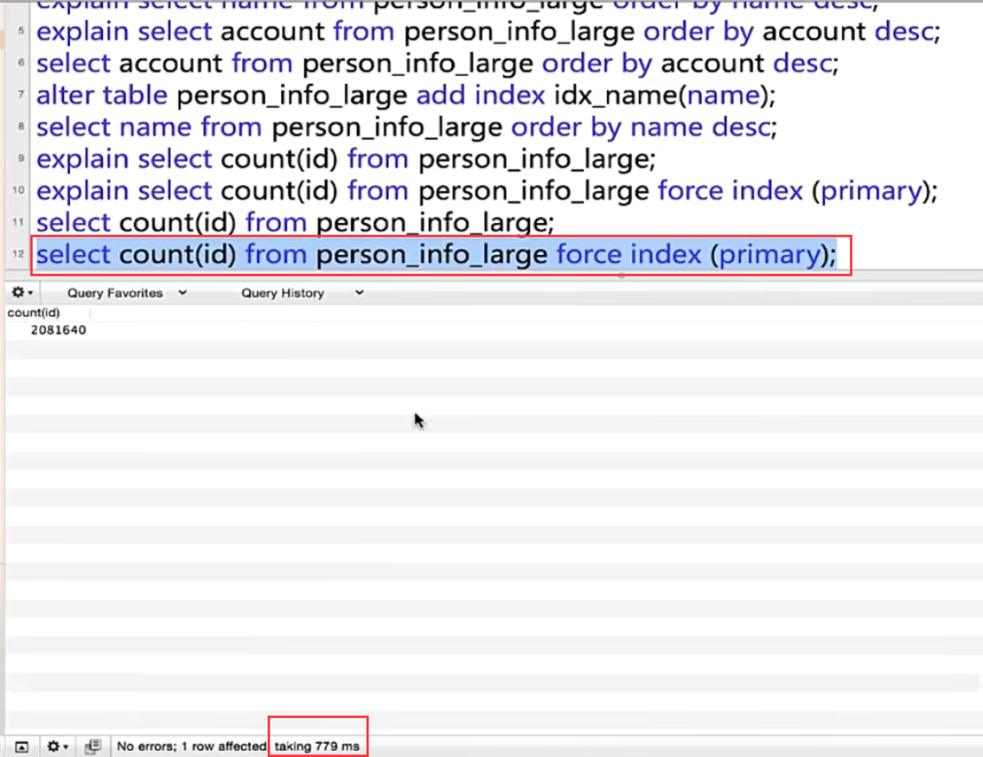 强制使用主键索引大致执行时间779ms