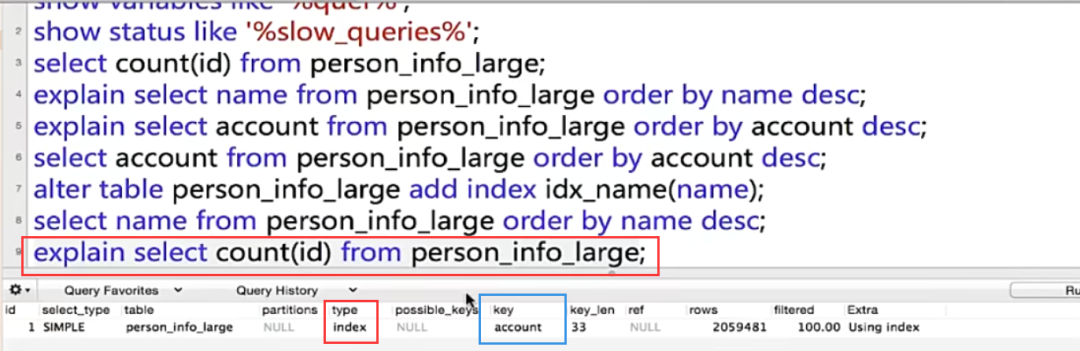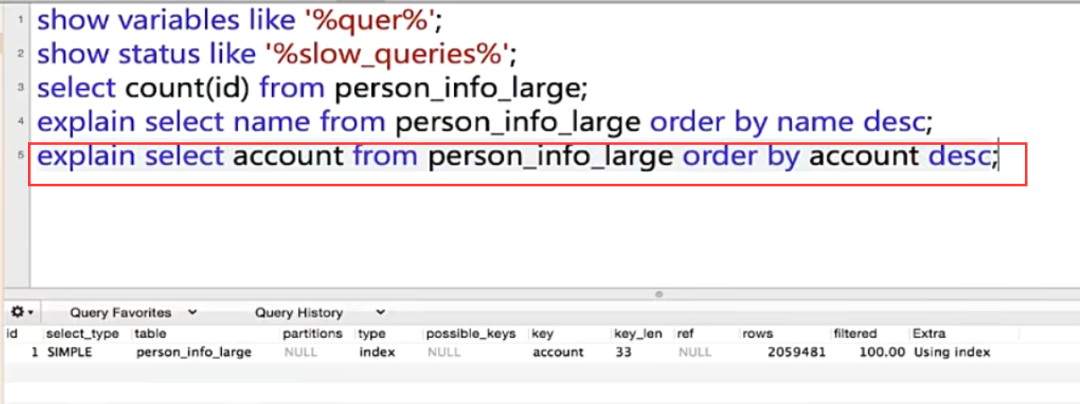 回到上一个话题,我们看到account是添加了唯一索引的字段。explain分析了执行计划后