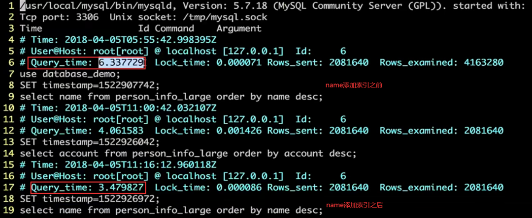 查看慢查询日志发现,使用索引之后,查询200W条数据的速度快了2s