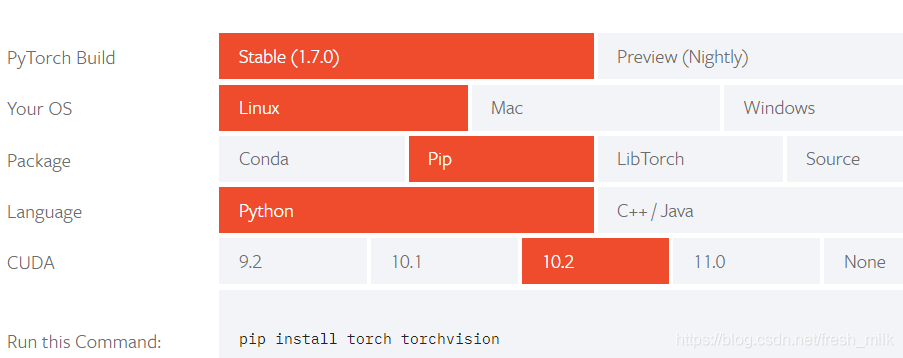 转到 官网 https://pytorch.org/get-started/locally/,根据个人需要选择,生成command