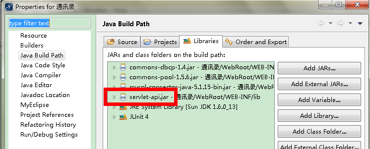 找到了HttpServlet的jar包后,为了方便,我将它复制到web工程的lib文件夹,然后在MyEclipse中将其添加进来即可。