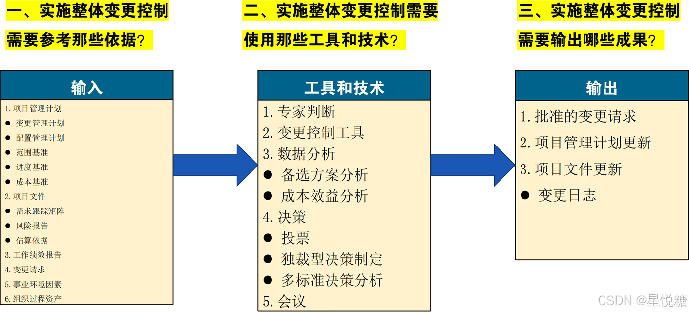 11、实施整体变更控制的输入、工具和技术以及输出都有哪些?